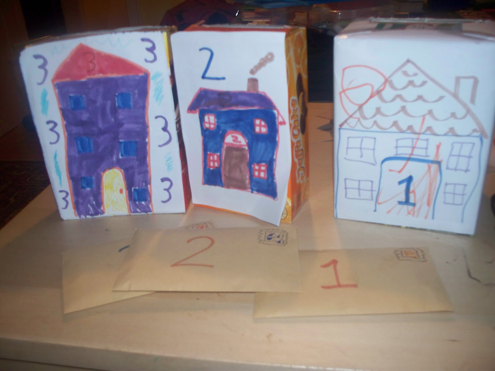 First we made some cardboard box houses each with a number on the door. Each has a letter box slot in the top, decorations are a family effort.